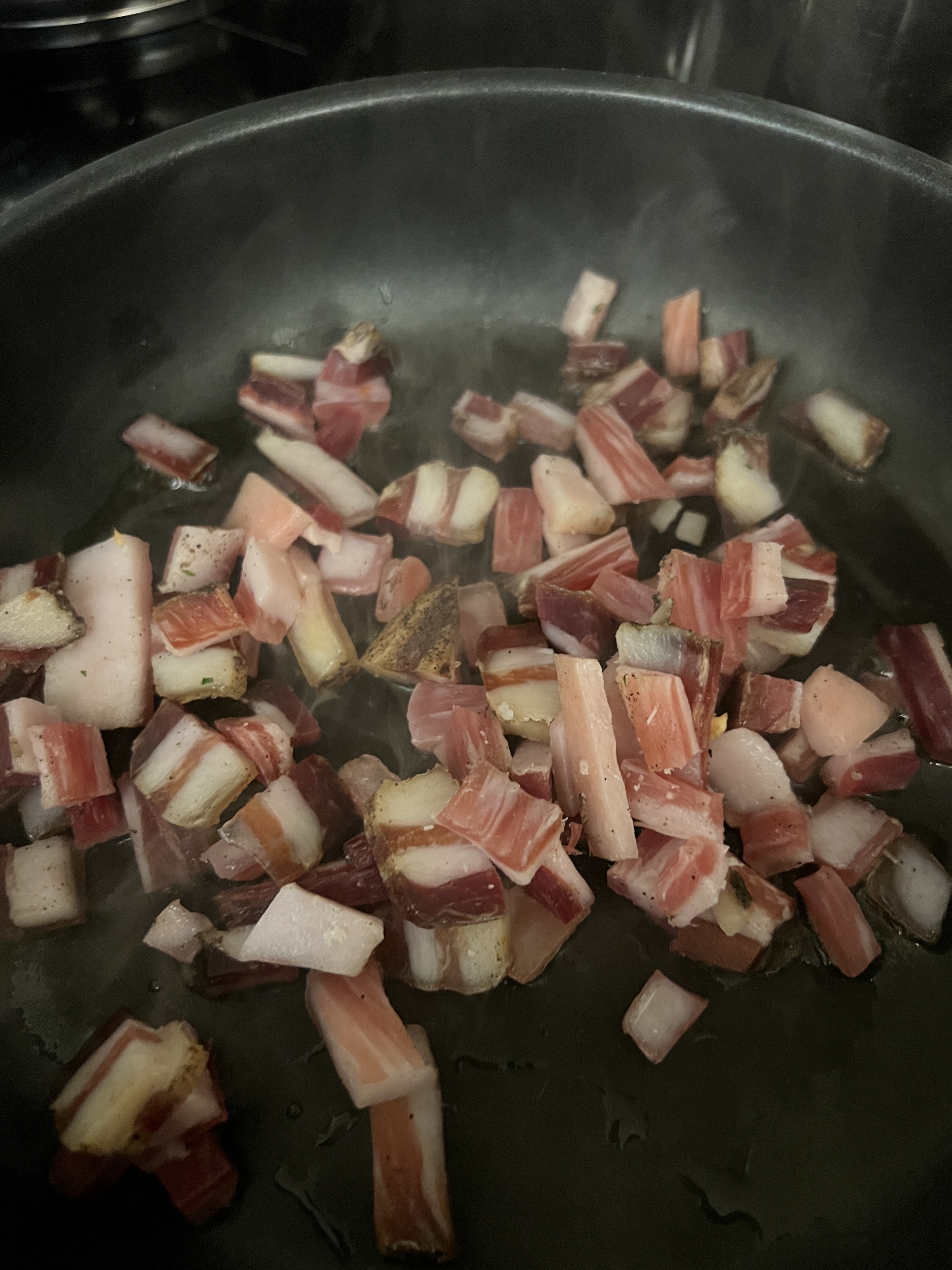 • 120 g Pancetta oder Bauchspeck, gewรผrfelt