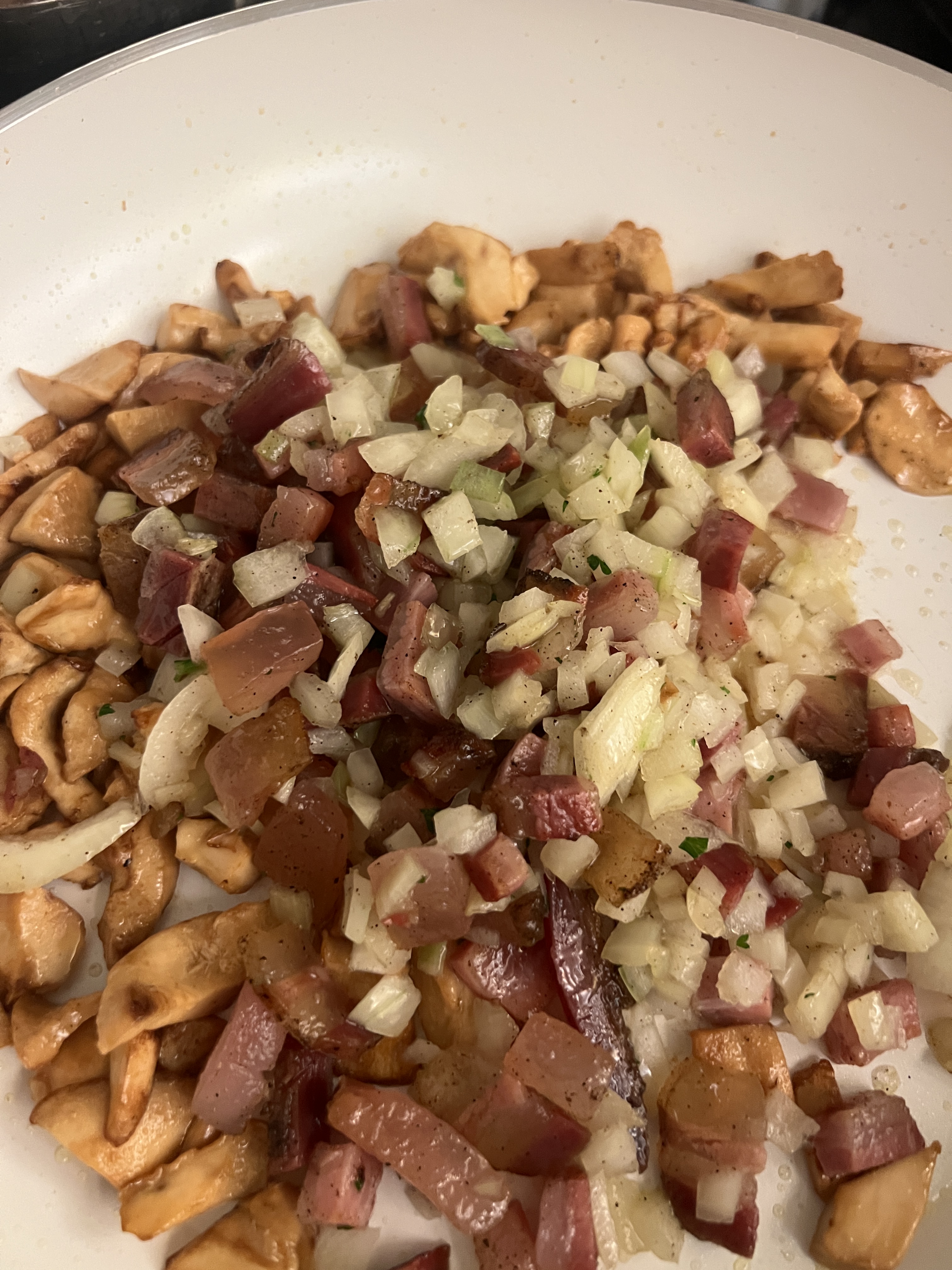 Speck zurรผck zu den Pilzen geben, dann Eier-Kรคse-Mischung unterheben.