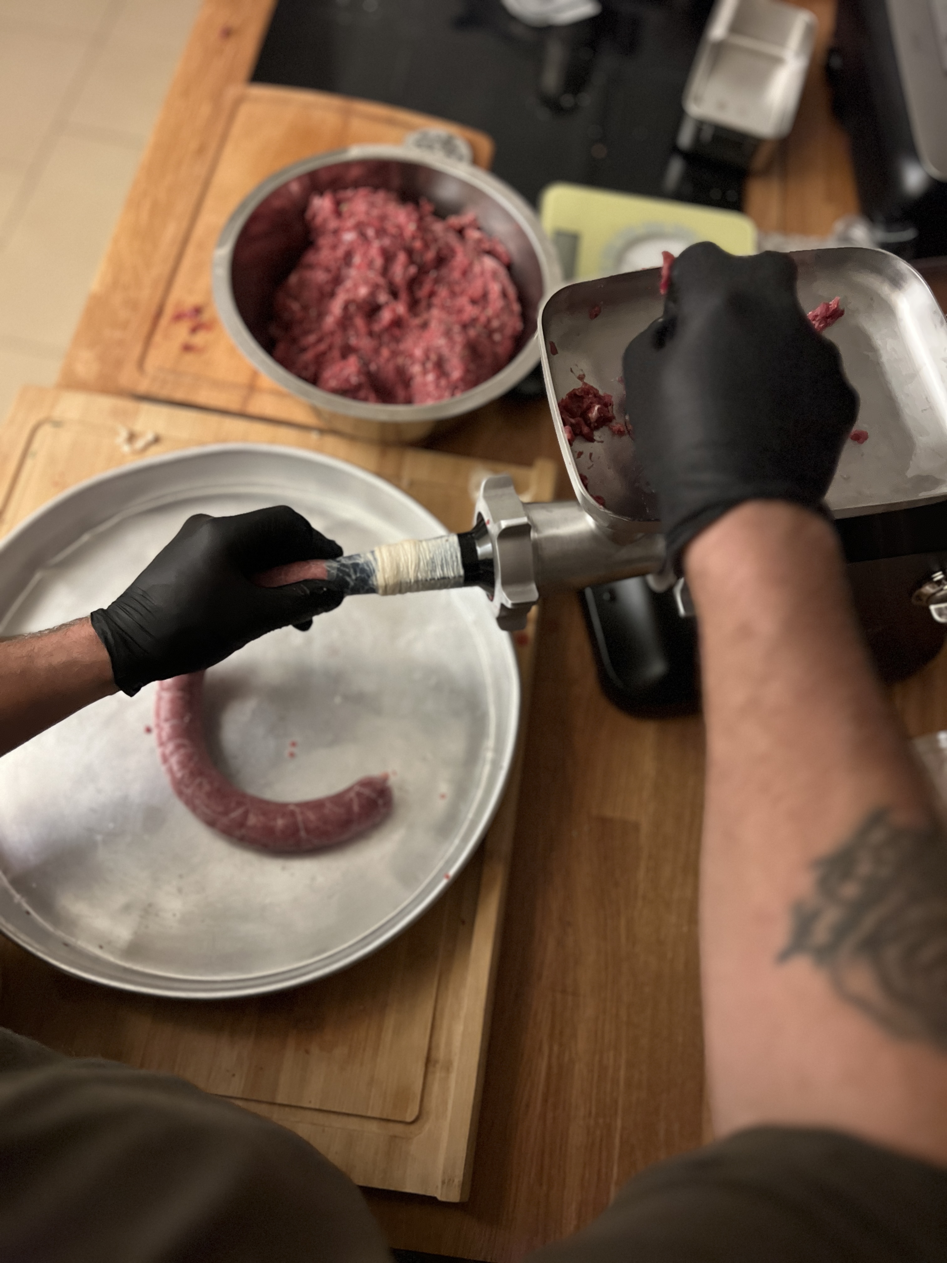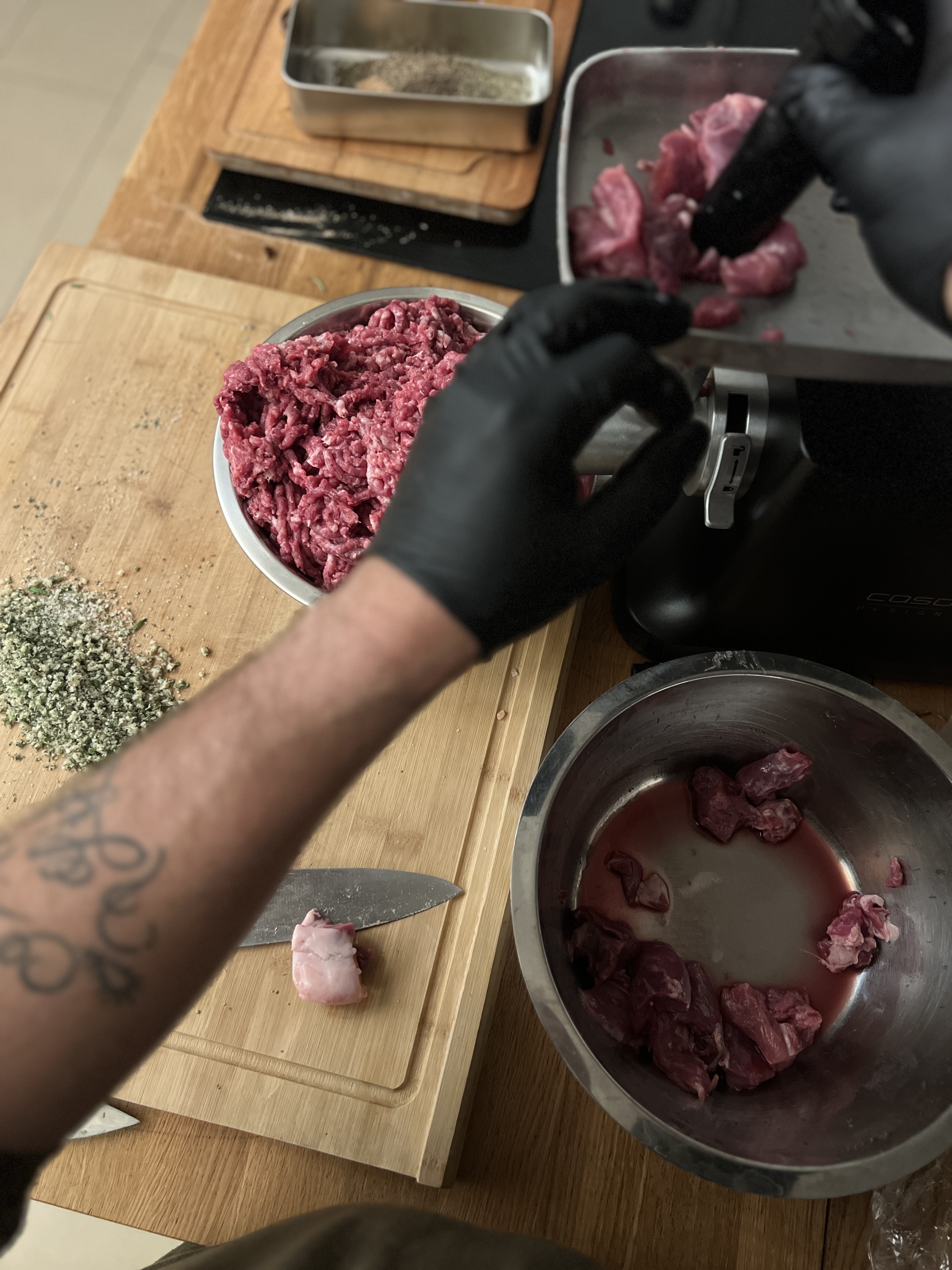 Fleisch und Speck gut gekรผhlt durch die 6โ8 mm Scheibe wolfen.
